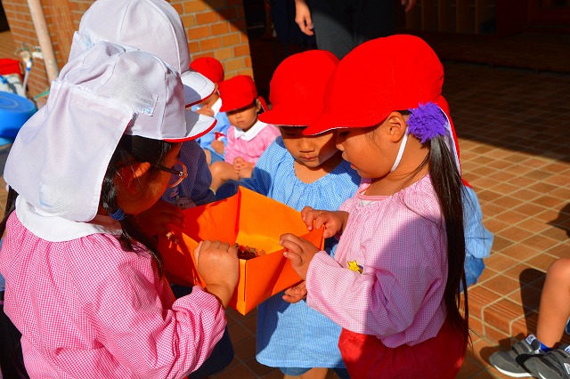 いただいた柿とキウイでお店屋さんの開店です。大喜びの子ども達でした。お金は、秋のもの2つを話しました。「トンボ」「ドングリ」「冷たい風」「赤い紅葉」「黄色いイチョウ」など、全員の子どもが話すことができました。言葉で、自分の考えていることを表現する生活を大事にしていきたいと考えています。