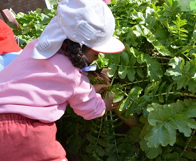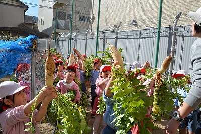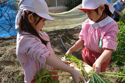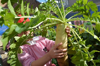 5歳児が秋から育てていた大根を収穫しました。大根の上をもって丁寧にゆするながら、抜きました。収穫した大根の大きさに「大きいねぇ~」「何にして食べようか」と会話が弾みました。残りの大根は、幼稚園でみんなでいただきたいと考えています。
