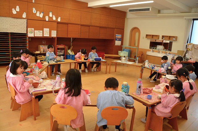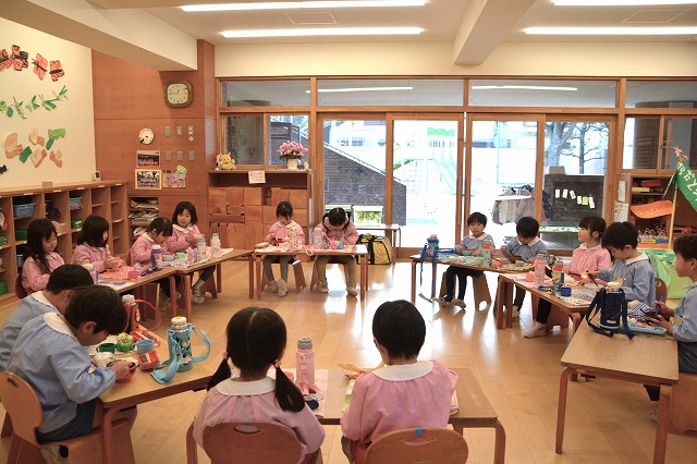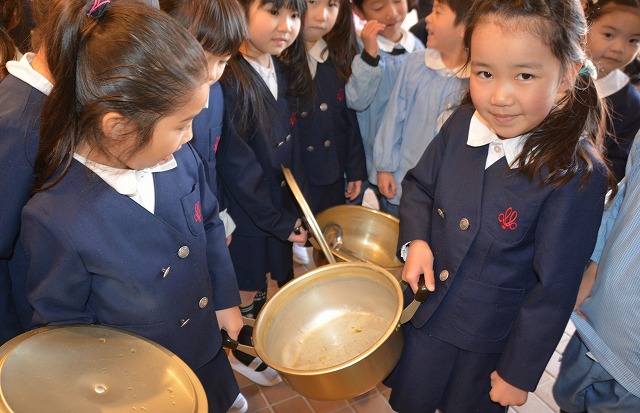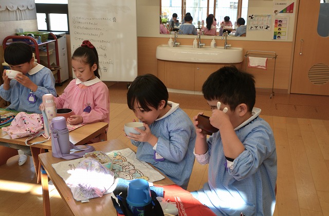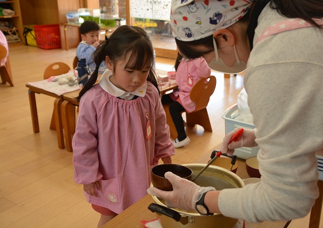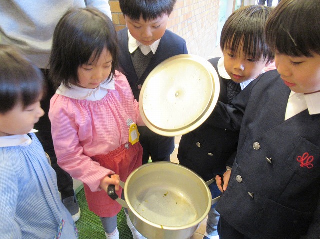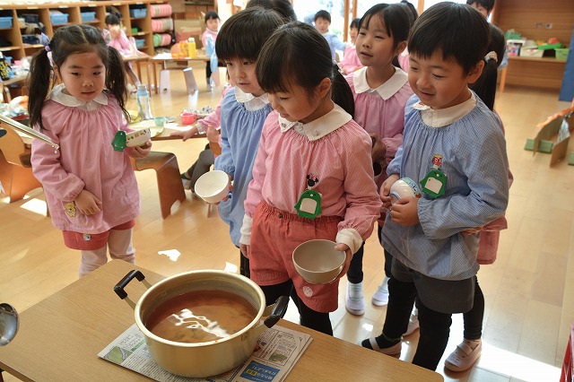 5歳児が育てていた大根を使って、味噌汁を作りました。野菜が嫌いな子も「幼稚園の大根、美味しいね」と食べていました。自分たちで育てた大根のお味は格別です。実体験することの大切さを感じます。