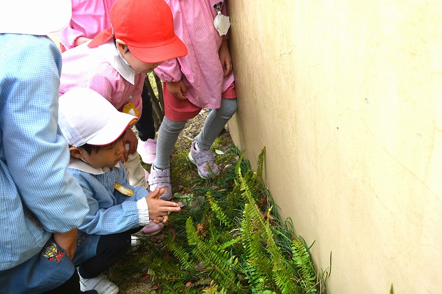 4歳児が劇遊びをした話の中にでてくるバッタをカメの禽舎で見つけました。話の中では、バッタのトビハネさんという名前でした。バッタを見つけるなり、「トビハネさんだ!!」「池に落ちてしまう」と大騒ぎです。そっと捕まえて、園庭の草のところに逃がしてあげることにしました。寒い中にも少しずつ春が近づいてきていることを感じている子ども達でした。