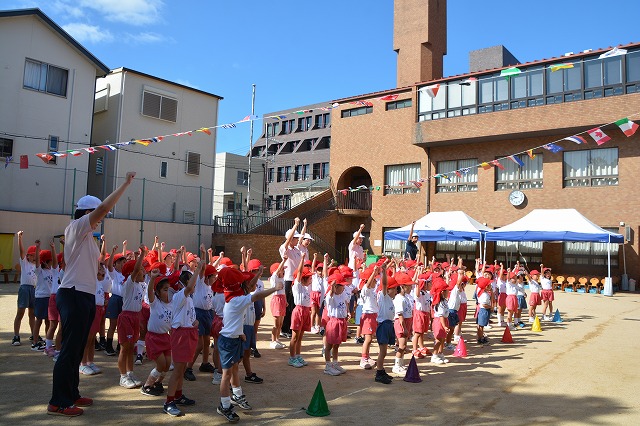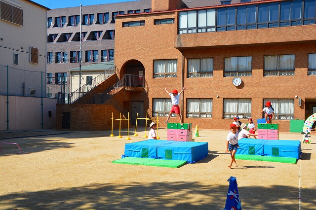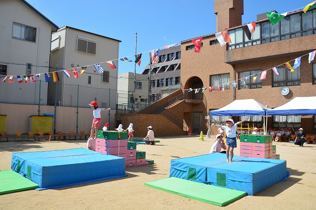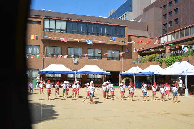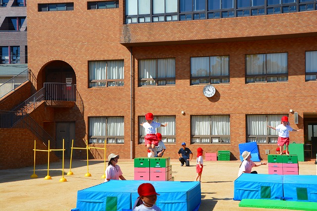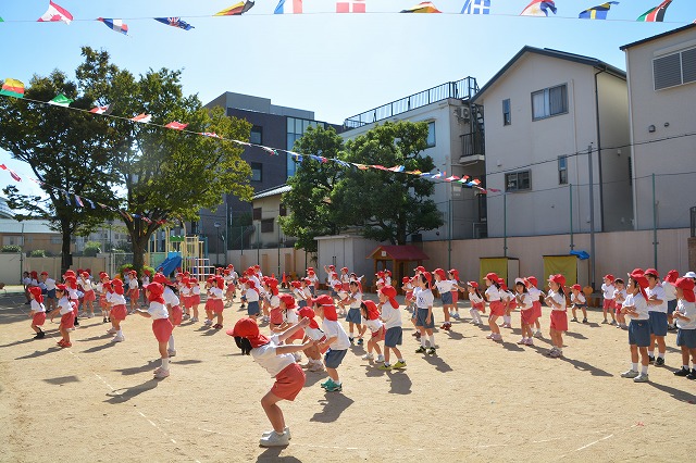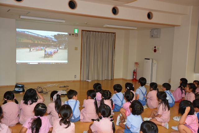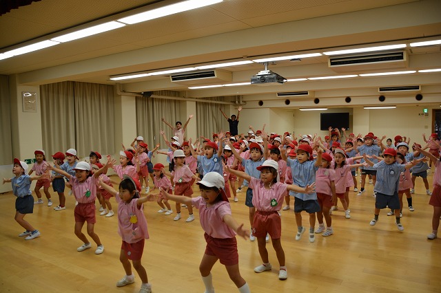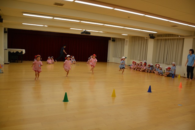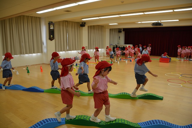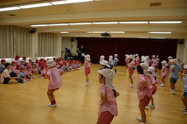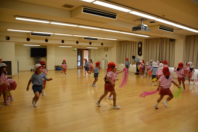 園庭は、まだまだ暑い日が続いていますが、遊戯室で身体を孫文ン動かして遊ぶことを楽しんでいる子ども達です。今日は、学年ごとに運藤遊びを楽しみました。