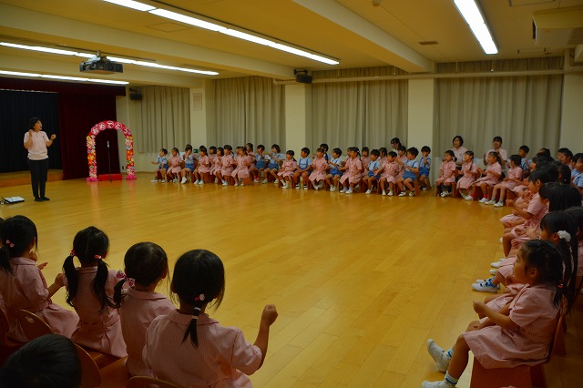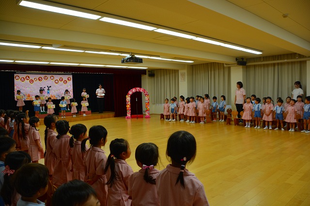 夏休み中でしたが、8月生まれの友達の誕生会を行ないました。1年に一度の誕生日です。久しぶりに友達と会った子ども達でしたが、誕生時の友達をしっかりとお祝いをし、誕生の友達はみんなに自己紹介を聞いてもらってお祝いをしてもらうことが嬉しそうでした。祝ってもらって嬉しい気持ちや、お祝をしようという気持ちを大切にしていきたいと考えています。