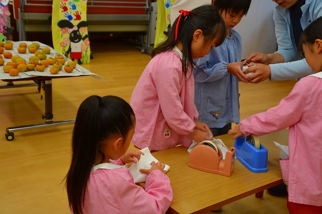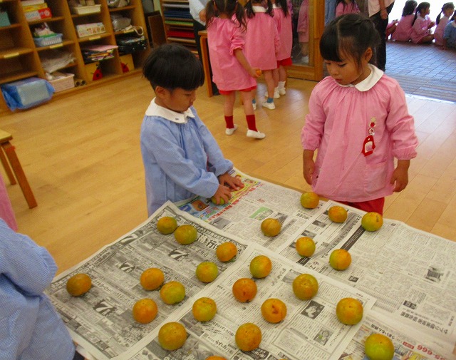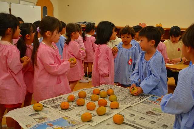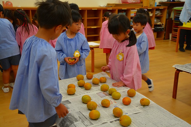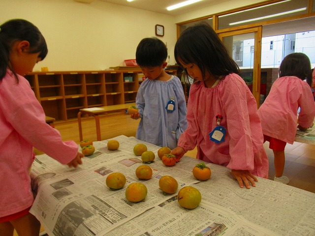 昨日、4歳児が秋の園外保育で出掛ける丹嶺学苑研修センターへ、園外保育の下見出掛けました。たくさんの柿がなっており、お土産にいただきました。今日はその柿のお店が附属幼稚園で開店しました。お金は、「秋」です。みんながみつけた「秋」の話をして、一人1個の柿のお買い物を楽しみました。