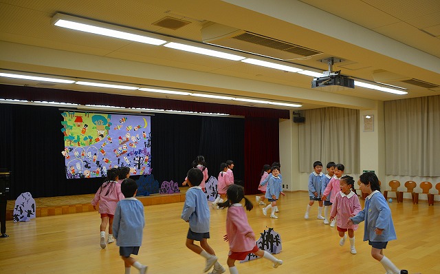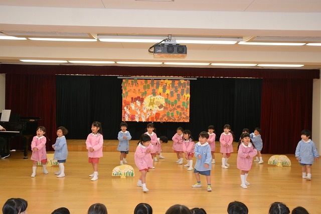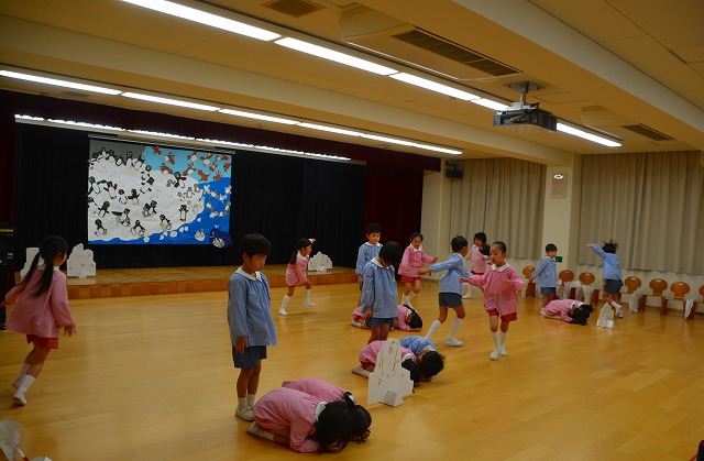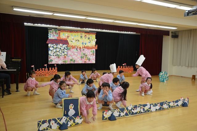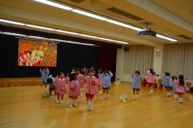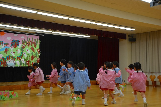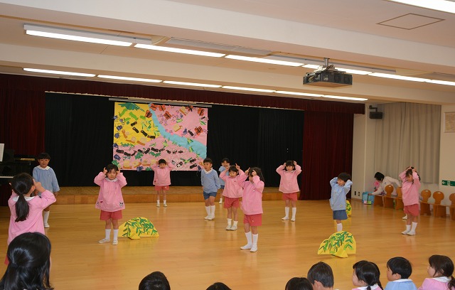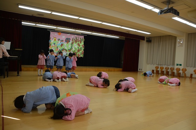 今日は、劇遊び発表会でした。お家の方に観ていただくことで、張り切っている子、少しドキドキしている子といろいろな姿が見られました。温かいお客様の眼差しに支えていただき、一人ひとりの子どもが自分らしく表現していました。友達と一緒に劇遊びをしたことで、一つ大きく成長した子ども達です。