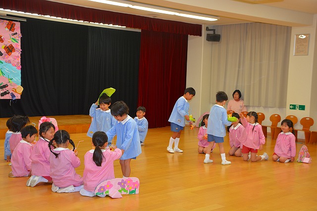 2月14日は、劇遊び発表会です。今日は、他のクラスの劇を見合いました。他のクラスの劇を興味深く、見ている子ども達でした。お客さんがいることで、演じる子ども達も、よりやる気が増します。みんなで、劇遊びを楽しんでいきたいと考えています。